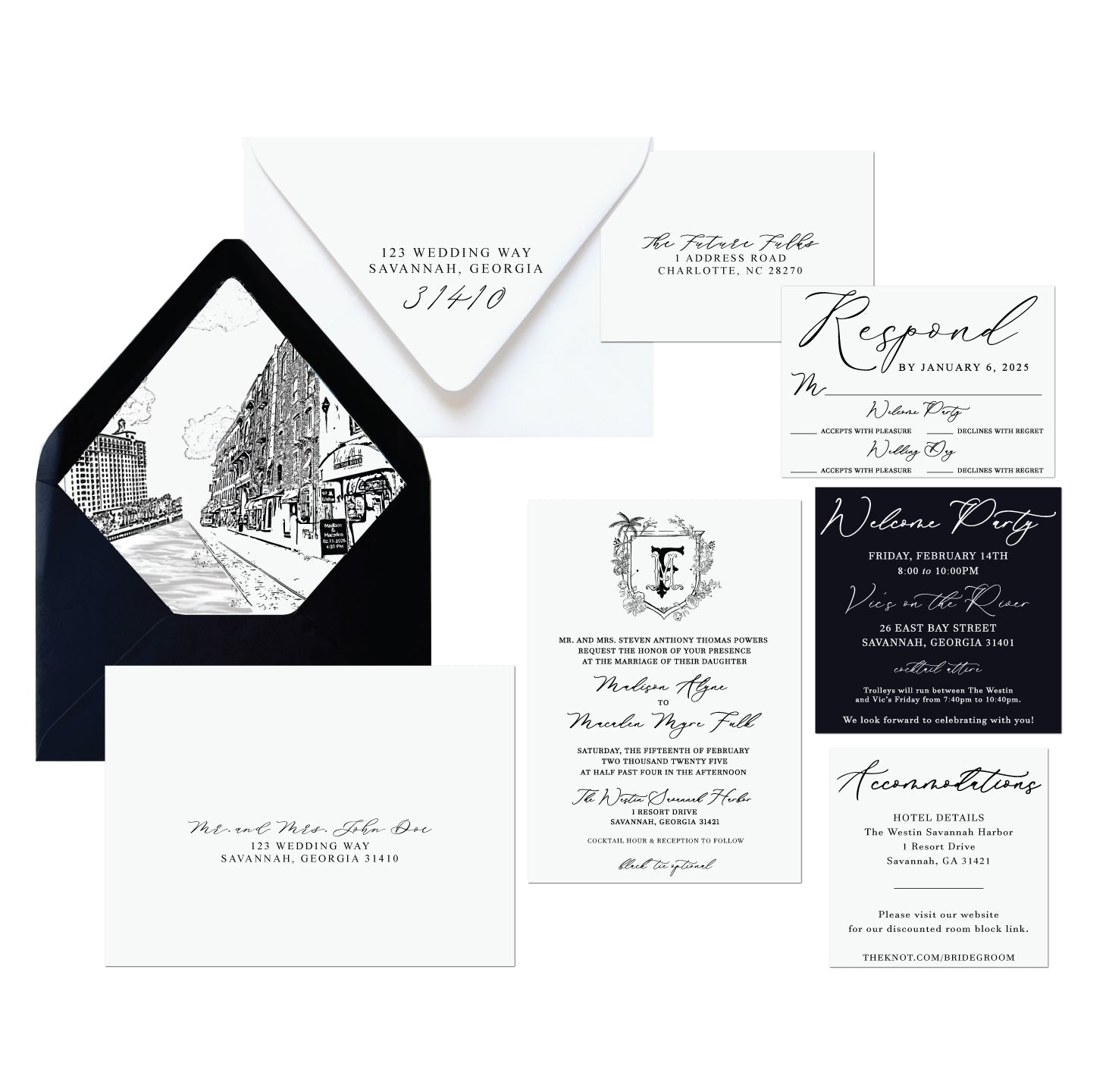 Invitations sold in sets of 25, with blank envelopes included. Envelope addressing options available.